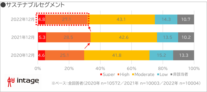 ① インテージサステナブルセグメントに置いて「サステナブル行動を進んで行う層(Super+High)」の割合は踊り場に。