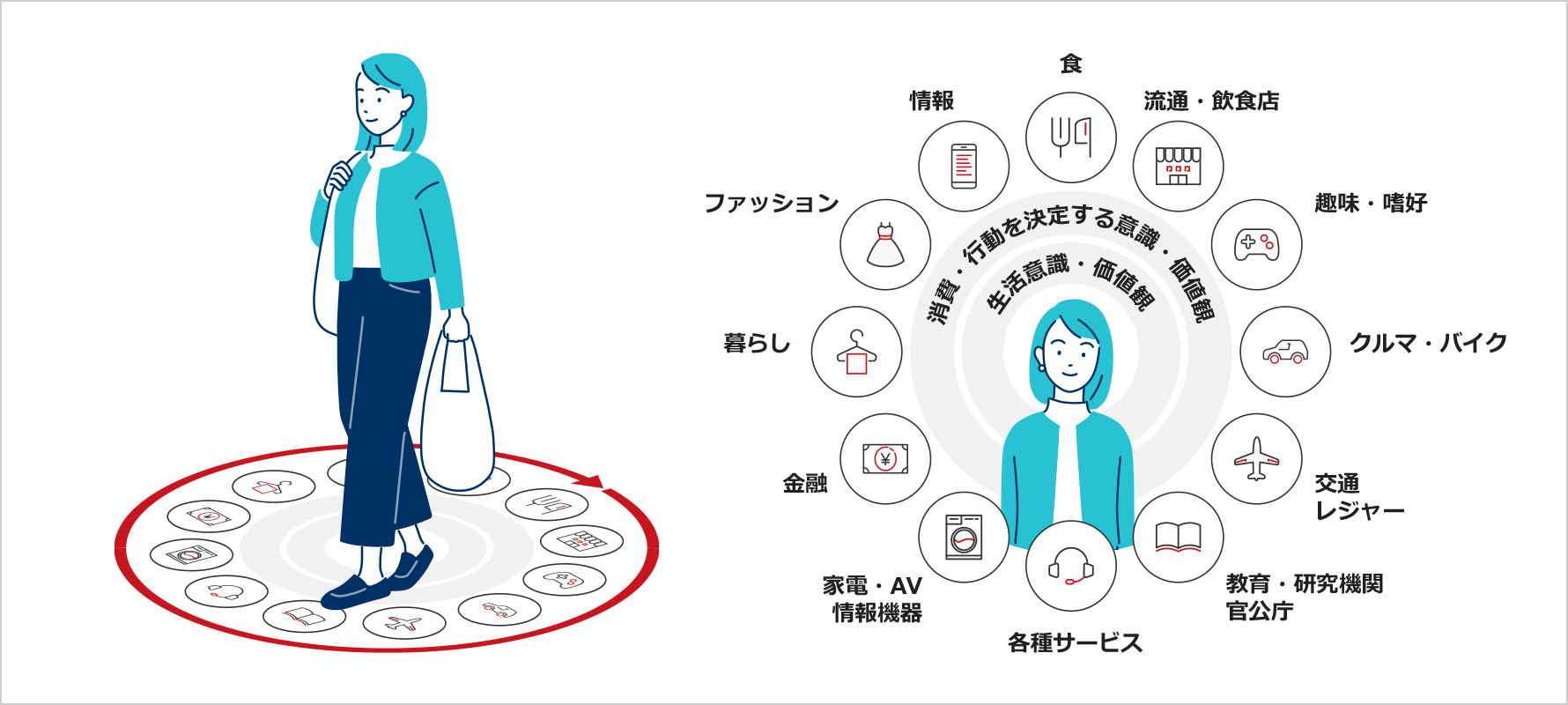 幅広く深い生活者理解を起点として、商品・サービス開発からコミュニケーション領域に渡る、マーケティングの諸施策の立案と実行を可能にします。