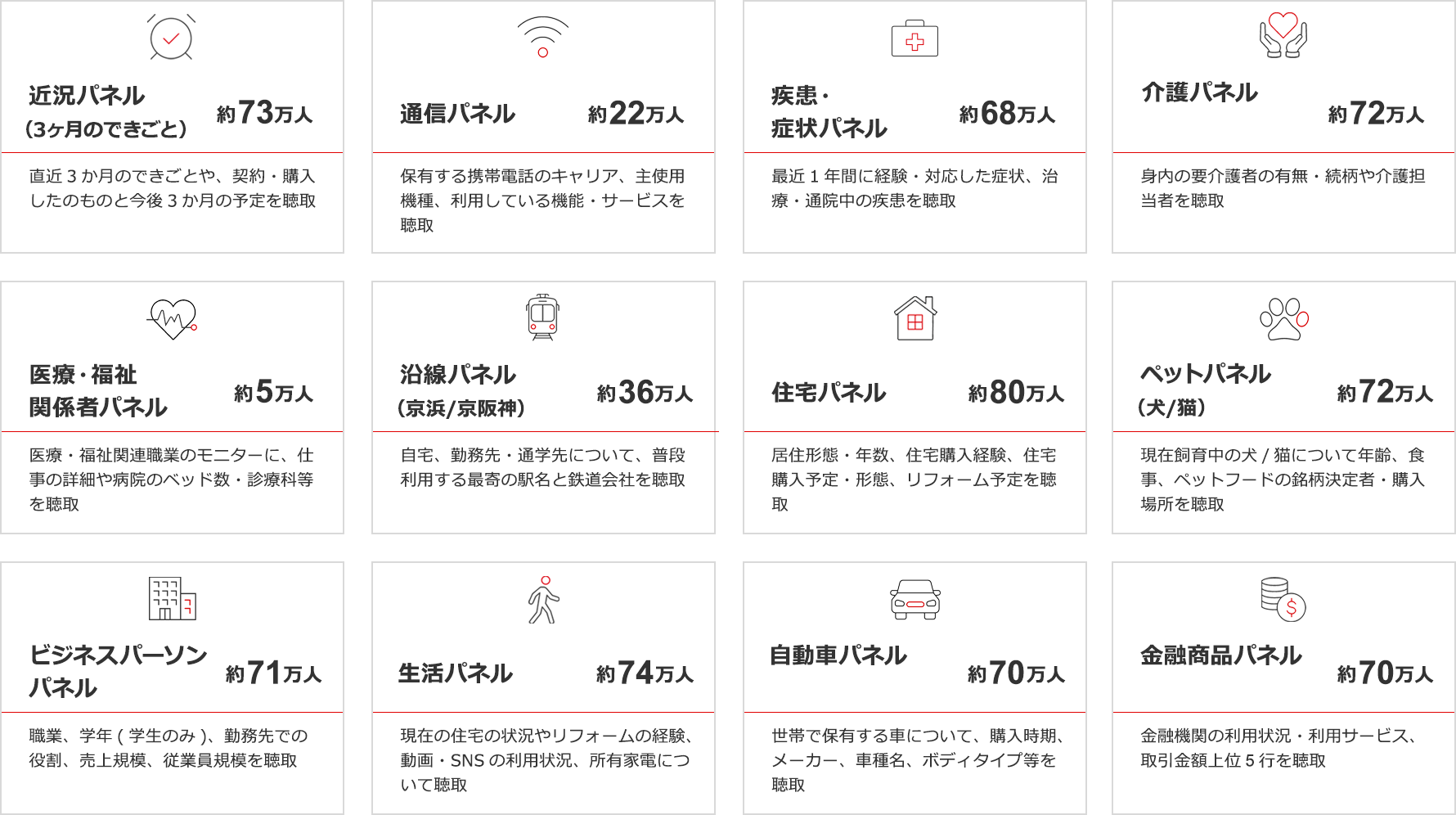 インテージの調査モニターは、性別、年齢、居住地、家族構成といった基本属性情報以外にも、最近のライフイベント(結婚、引越しetc.)、購入したもの、保有している自動車など、12の特定のテーマについて聴取した情報をサブパネルとしてご用意しています。