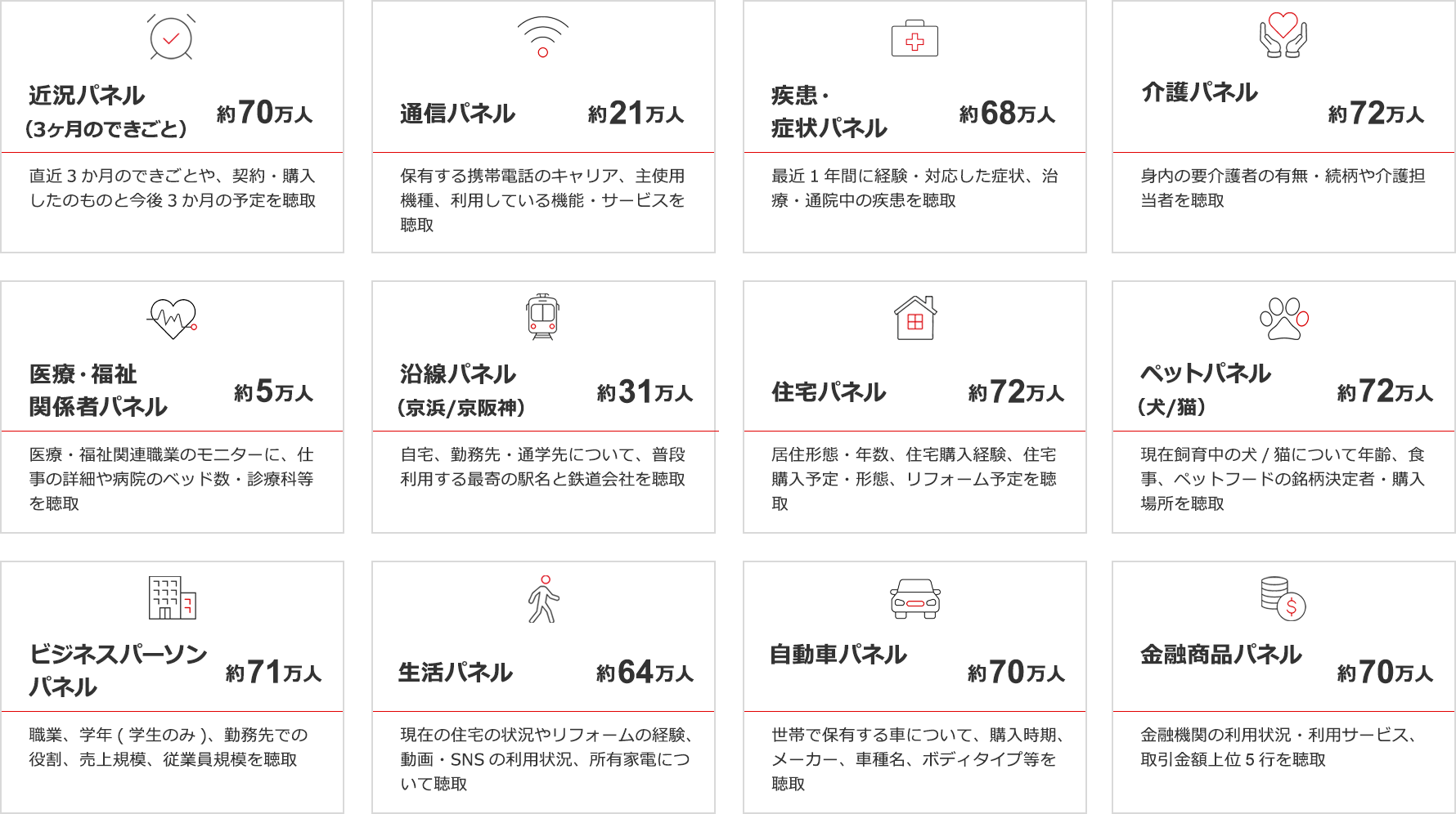 インテージの調査モニターは、性別、年齢、居住地、家族構成といった基本属性情報以外にも、最近のライフイベント(結婚、引越しetc.)、購入したもの、保有している自動車など、12の特定のテーマについて聴取した情報をサブパネルとしてご用意しています。