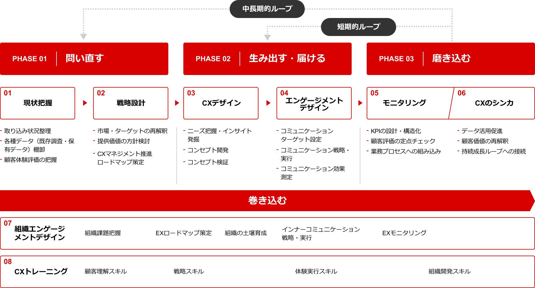 これら4つのフェーズにおいて、今取り組むべき課題からCXマネジメントをスタートし、”あるべき顧客体験”の育成循環を構築します。